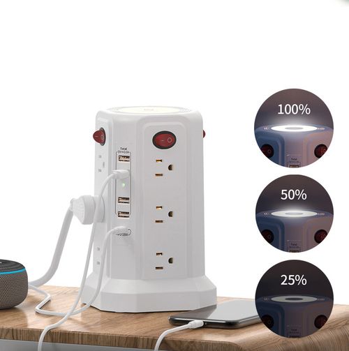 New product: 12-socket AC power strip with flat plugs for USB USB-C ports, surge-protected power strip with 4 USB charging ports, desktop power strip with extension cord, and night light.